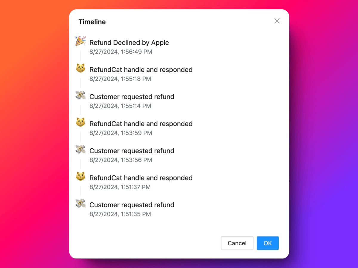 Every operation handled by RefundCat is recorded and displayed in the timeline. You can see when RefundCat received the refund request, when it sent the response back to Apple, and when Apple approved or declined the refund request.